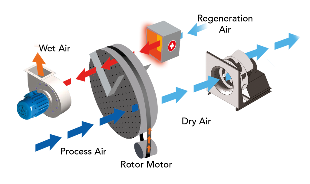 Description: Rotor dehumidifiers use a rotating desiccant wheel to absorb moisture from the air. The rotor continuously removes humidity and regenerates itself through a heating process, making it highly effective even at low temperatures and low humidity levels.